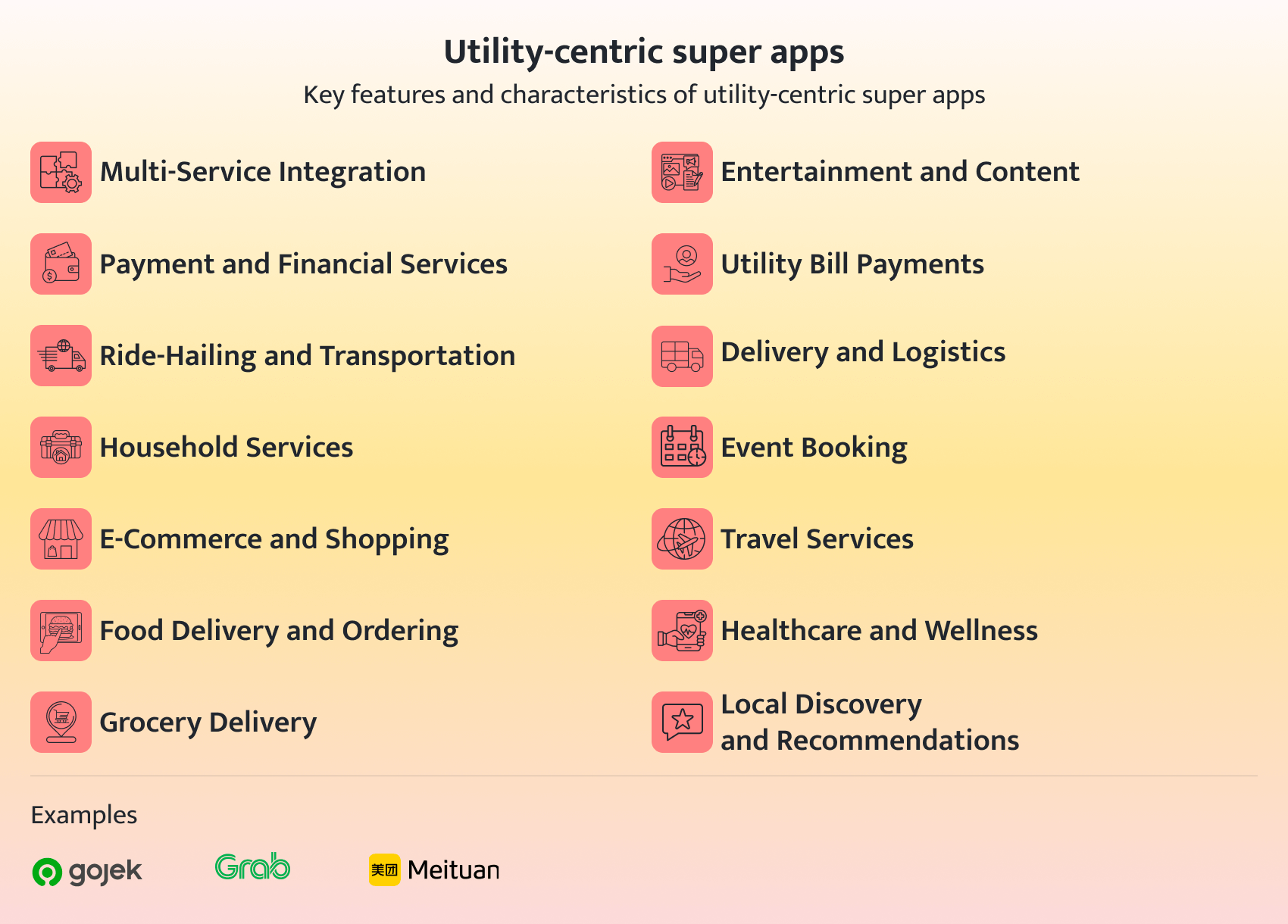 These super apps revolve around essential utility services such as ride-hailing, food delivery, and bill payments. They simplify daily tasks by offering seamless access to various services within a single app.